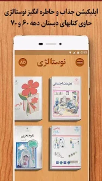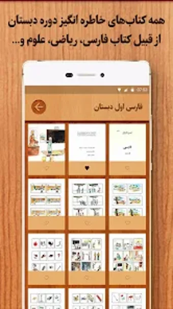 يتميز التطبيق بتصميم جميل وجذاب يشبه مقاعد المدرسة القديمة. يعزز ذكريات أيام المدرسة القديمة برسوماته الجميلة وشعوره الحنيني. يمكنك إضافة العناصر المفضلة إلى قائمة الكتب المفضلة ومشاركة المحتوى من الكتب المدرسية في تطبيقات أخرى. يحتوي التطبيق على قائمة بكتب المدرسة الابتدائية، بما في ذلك كتب اللغة الفارسية من الصف الأول إلى الصف الخامس، كتب العلوم من الصف الأول والثاني، كتب الرياضيات من الصف الأول، وكتب التعاليم الاجتماعية والتعاليم الدينية من الصف الثالث.